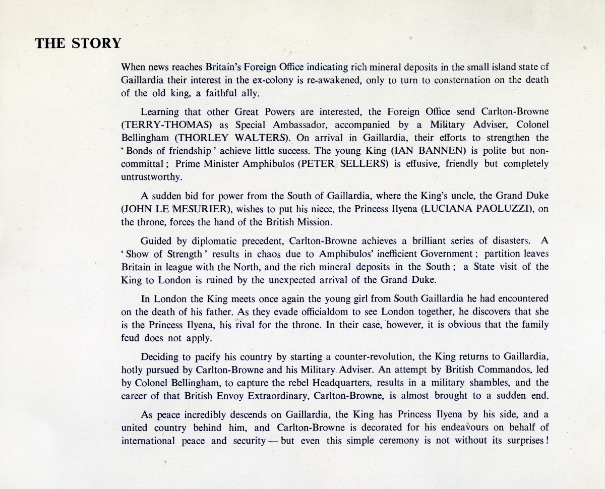 Carlton-Browne of the F.O. follows the story of a long-forgotten British colony named Gaillardia, which suddenly becoming geopolitically hot property due to the discovery of rare mineral deposits. As the Foreign Office scramble to reassert influence, enter Carlton-Browne – a charmingly clueless diplomat whose only qualification is his father’s legacy and a knack for accidental diplomacy. Dispatched to the island, Carlton (Terry-Thomas) must navigate a tangled web of Cold War tensions, royal intrigue, and Morris dancing mishaps. As rival factions vie for control and foreign powers circle like vultures, Carlton stumbles through espionage, romance, and revolution – proving that sometimes, the most unlikely man can make the biggest mess… and still come out ahead.